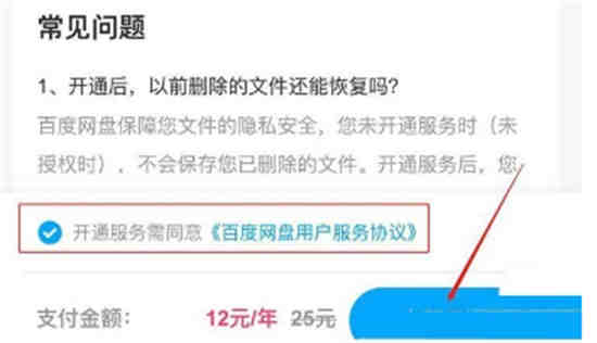 5、最后在“文件恢复服务”的界面中,勾选“开通服务须同意《百度网盘用户服务协议》”选项,点击下方的“立即开通”按钮。
